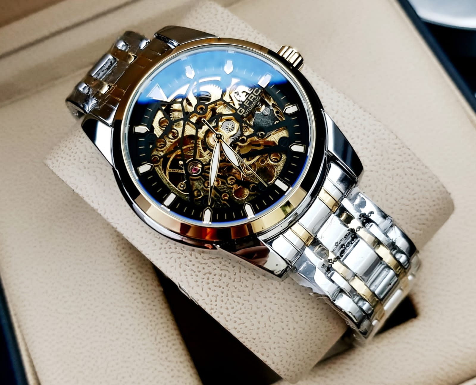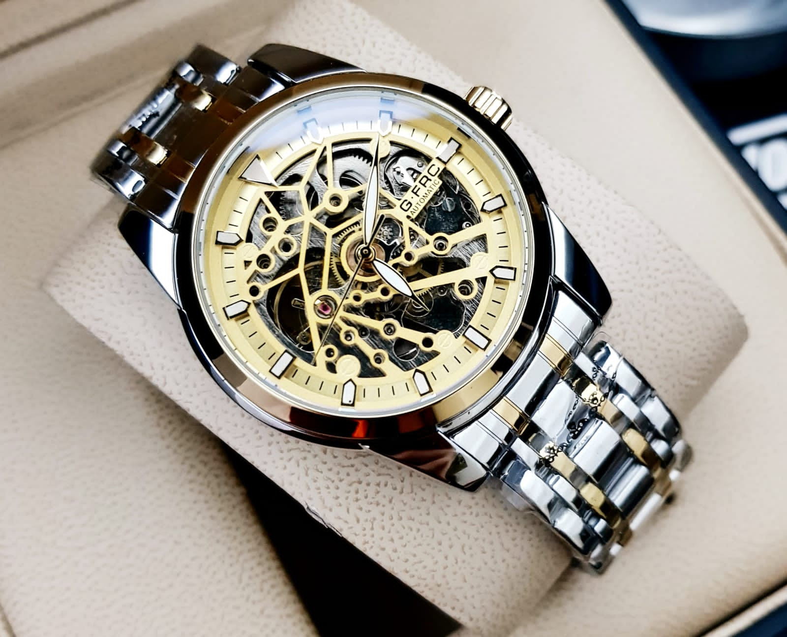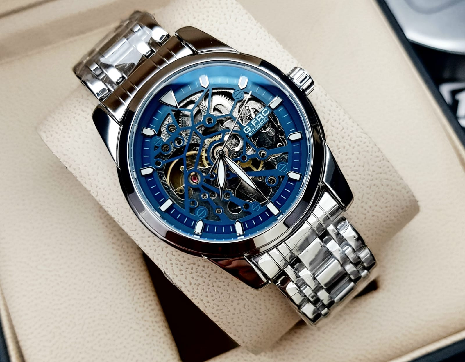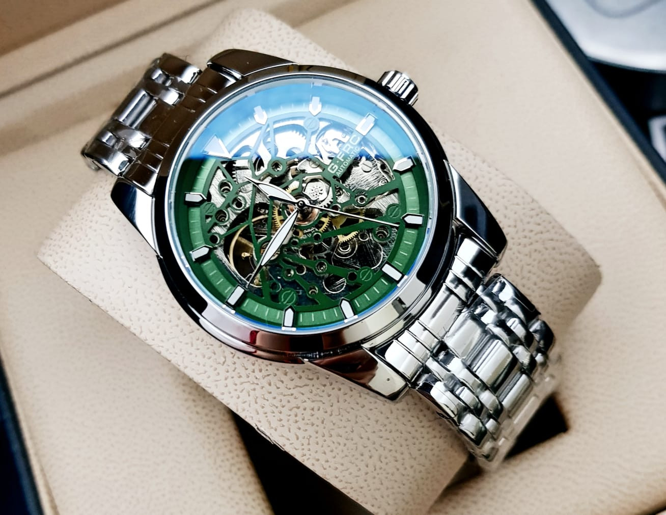Este reloj combina fuerza y elegancia en un solo accesorio. Su mecanismo automático te libera de pilas, mientras su diseño imponente eleva tu estilo. Calidad premium a un precio que sorprende.
